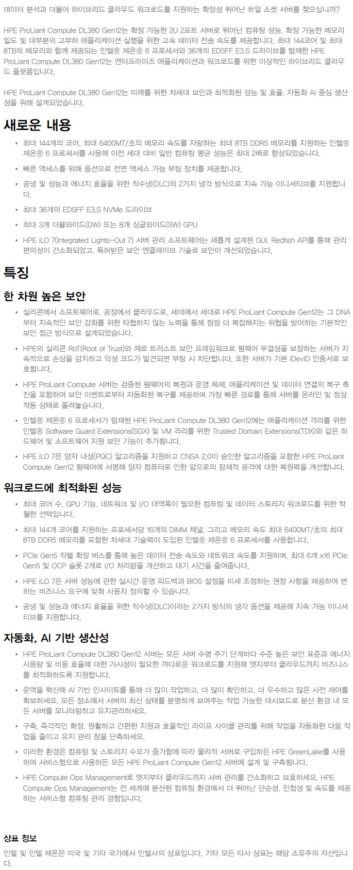 갤러리 카테고리 HPE ProLiant DL380 Gen12 등록일 2025-05-27 아이노리 첨부파일 HPE ProLiant Compute DL380 Gen12데이터 시트-PSN1014865653KRKO.pdf 0회 다운로드 | DATE : 2025-05-27 04:02:43 관련링크 https://psnow.ext.hpe.com/product?id=1014865653 19회 연결 HPE DL380 Gen12 12EDSFF CTO Server with HPE DL3XX Gen12 Multipurpose Kit & DLC(Direct Liquid Cooling) module 이전글 HPE ProLiant Compute DL380a Gen12 다음글 HPE ProLiant DL360 Gen12 목록