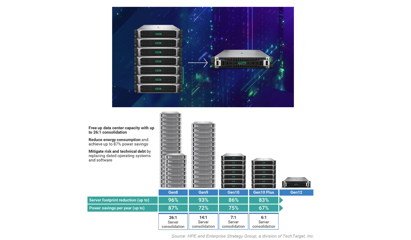 Consolidate and save with up to 7:1 consolidation and 65% in power savings using the latest ProLiant servers to replace Gen10.